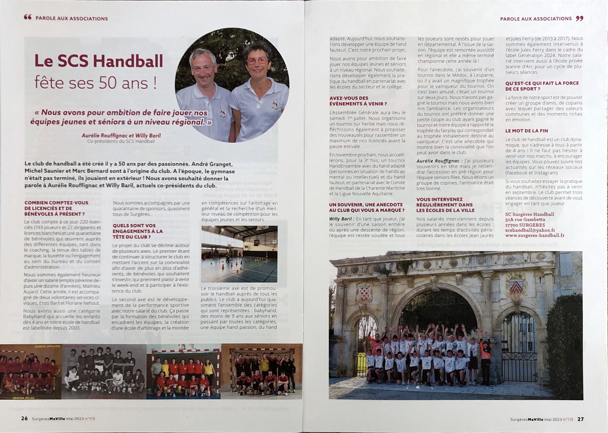 Le SCS Handball fête ses 50 ans! 31 mai 202325 juillet 2023 jessica giraud Aucun commentaire Article du magazine municipal d’information de la Ville de Surgères – Mai 2023 Bureau